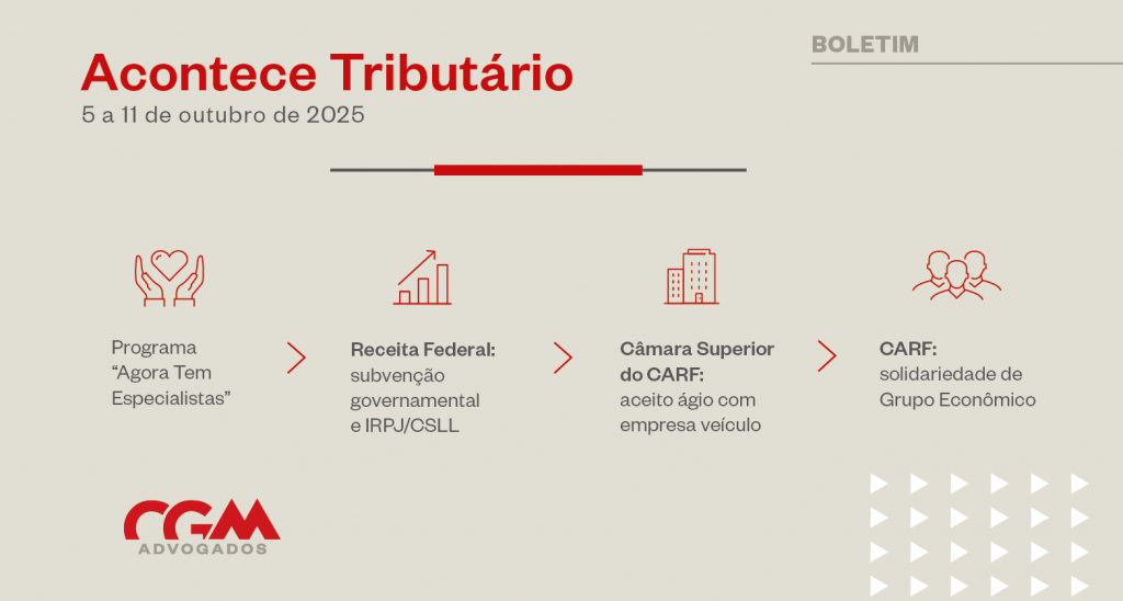 Em 8/10, foi publicada a Lei nº 15.233/2025 (resultante da conversão da Medida Provisória nº 1.301/2025), que, dentre outras providências, instituiu o Programa “Agora Tem Especialistas”, que busca promover um atendimento médico mais ágil e eficiente para a população. O estabelecimento hospitalar privado que tiver o requerimento de adesão ao Programa deferido poderá obter créditos financeiros relativos ao total dos valores de atribuição dos atendimentos médico-hospitalares, que poderão ser utilizados na compensação de tributos federais, inscritos ou não em dívida ativa da União.
